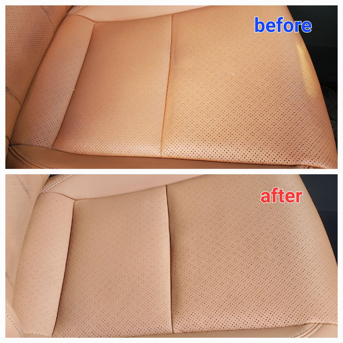 専用のクリーナーでブラッシングと拭き上げ、乾燥をレザー表皮を痛めないように数回に分けて施工し、付着色を落として最後にレザー専用のコーティングを塗り込み施工完了!!