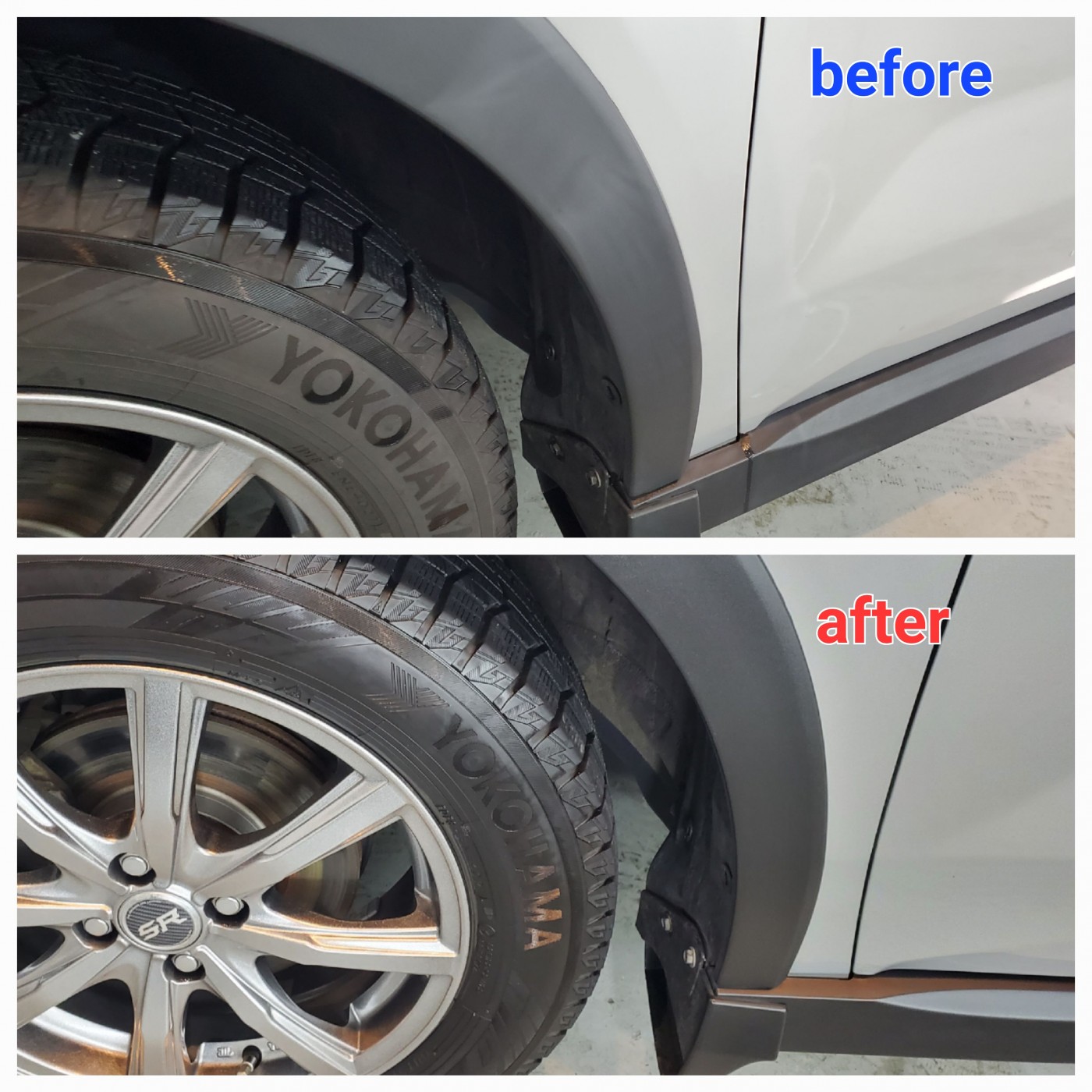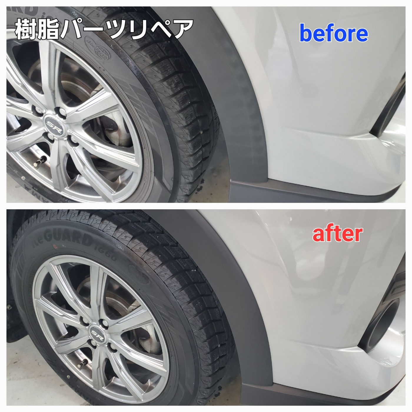 バンパーやドアの樹脂部分が劣化のため白く色褪せしてしまってお困りのお客様よりボディー磨きと樹脂パーツリペアのご依頼をいただきました。