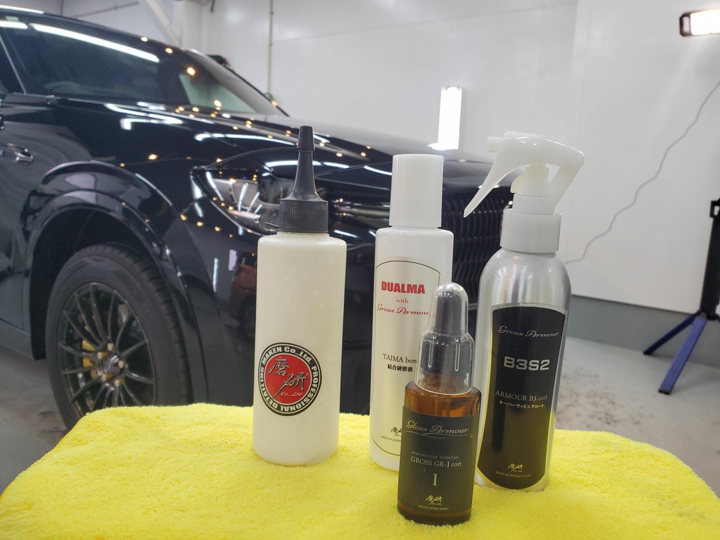 先ず初めに、ボディークレンジングからのボディー磨きにて雨染みや洗車傷をリセットして、TAIMA(コーティング結合研磨液)にて下地処理をしっかりと施工してから、ガラスコーティングのグロスアーマーを塗り込みして施工完了!