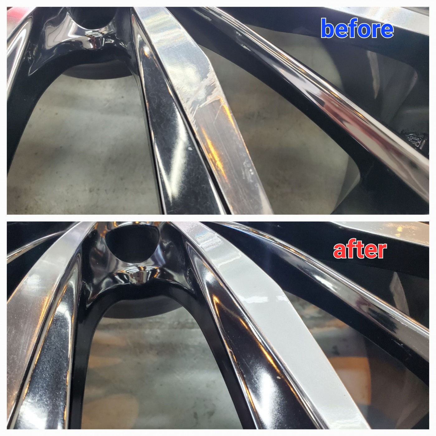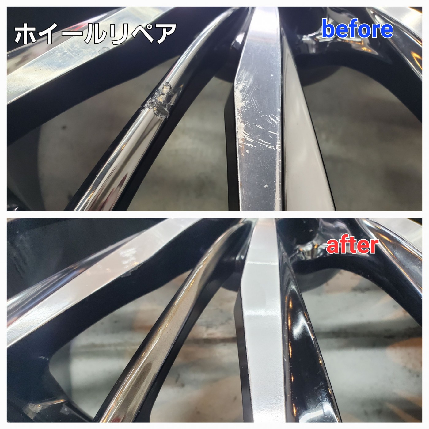 タイヤ交換時に立て掛けておいたホイールが倒れてしまい傷を付けてしまった お客様からのご依頼で、ダイヤカット仕上げ部の傷とスパッタリング仕上げ部のスポークのリペアをご依頼いただきました。