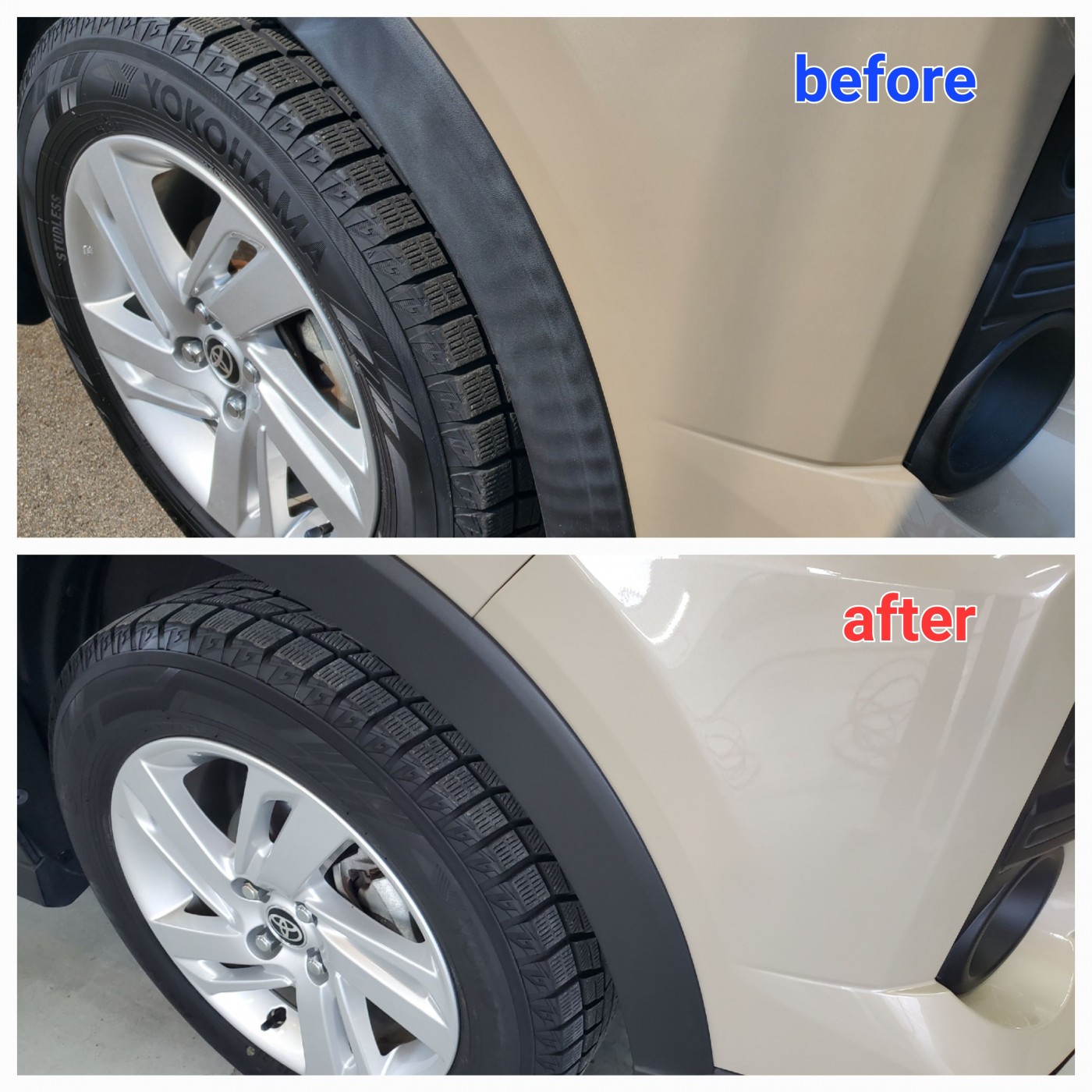 中古で購入した車両のバンパーやドアの樹脂部分が劣化のため白く色褪せしているのと擦り傷が付いてしまっていてお困りのお客様より樹脂パーツリペアのご依頼をいただきました。