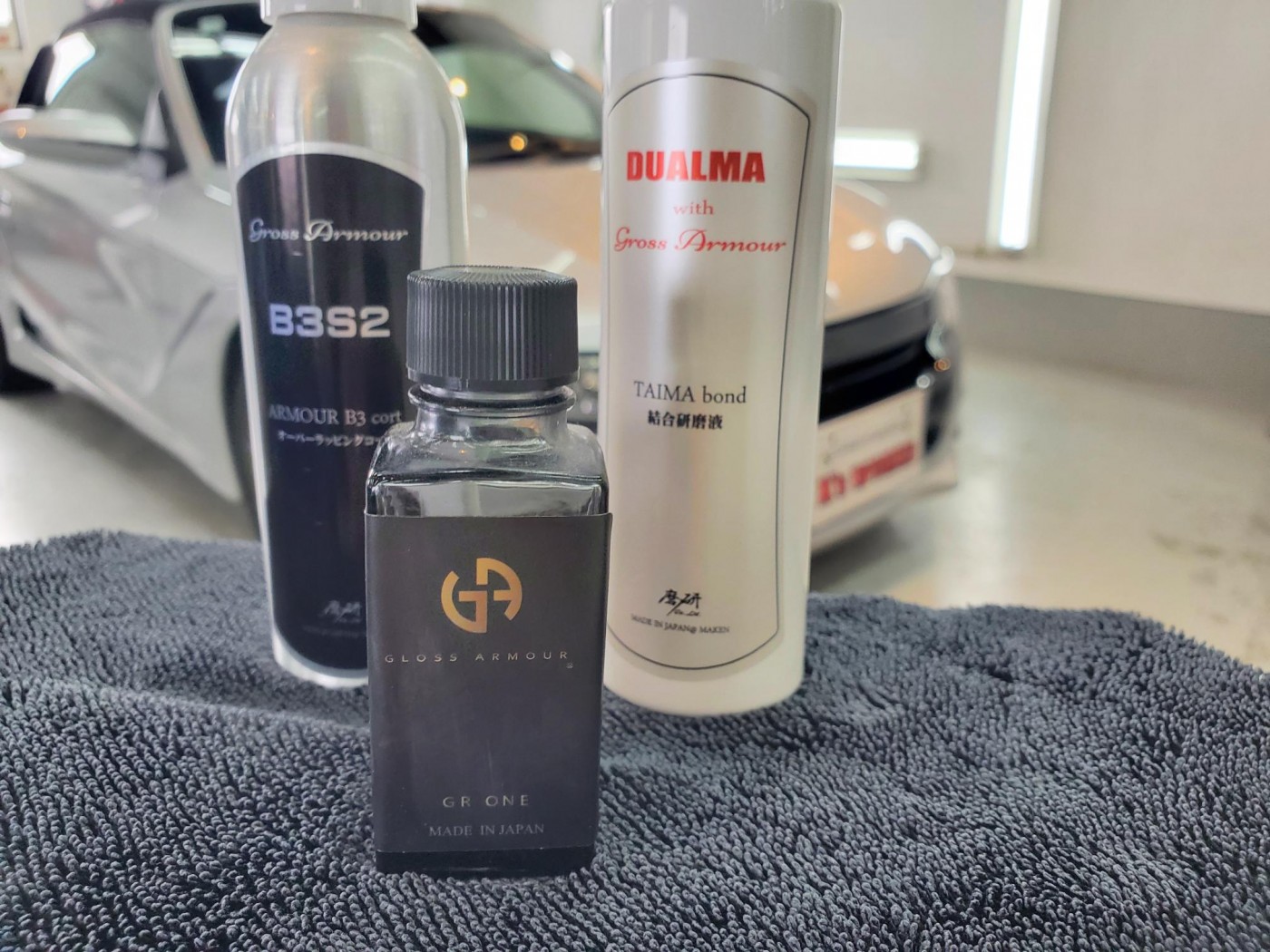 先ず初めに、ボディークレンジングからのボディー磨きにて雨染みや洗車傷をリセットして、TAIMA(コーティング結合研磨液)にて下地処理をしっかりと施工してから、ガラスコーティングのグロスアーマーを塗り込みして施工完了!