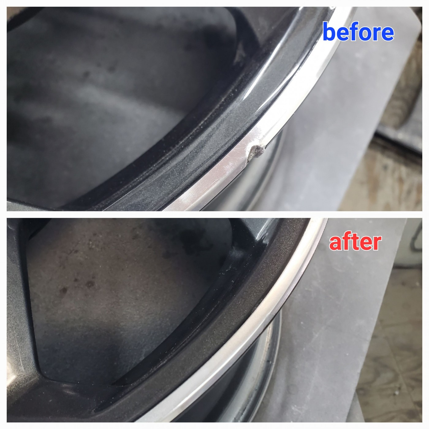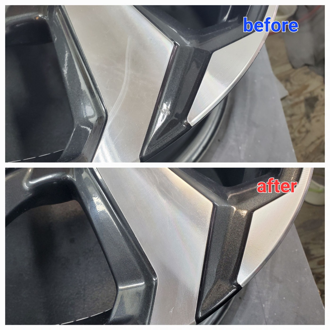 車を寄せすぎて縁石に擦ってしまい傷を付けてしまった お客様からのご依頼で、ダイヤカット部とガンメタ塗装部の傷のリペアをさせていただきました。