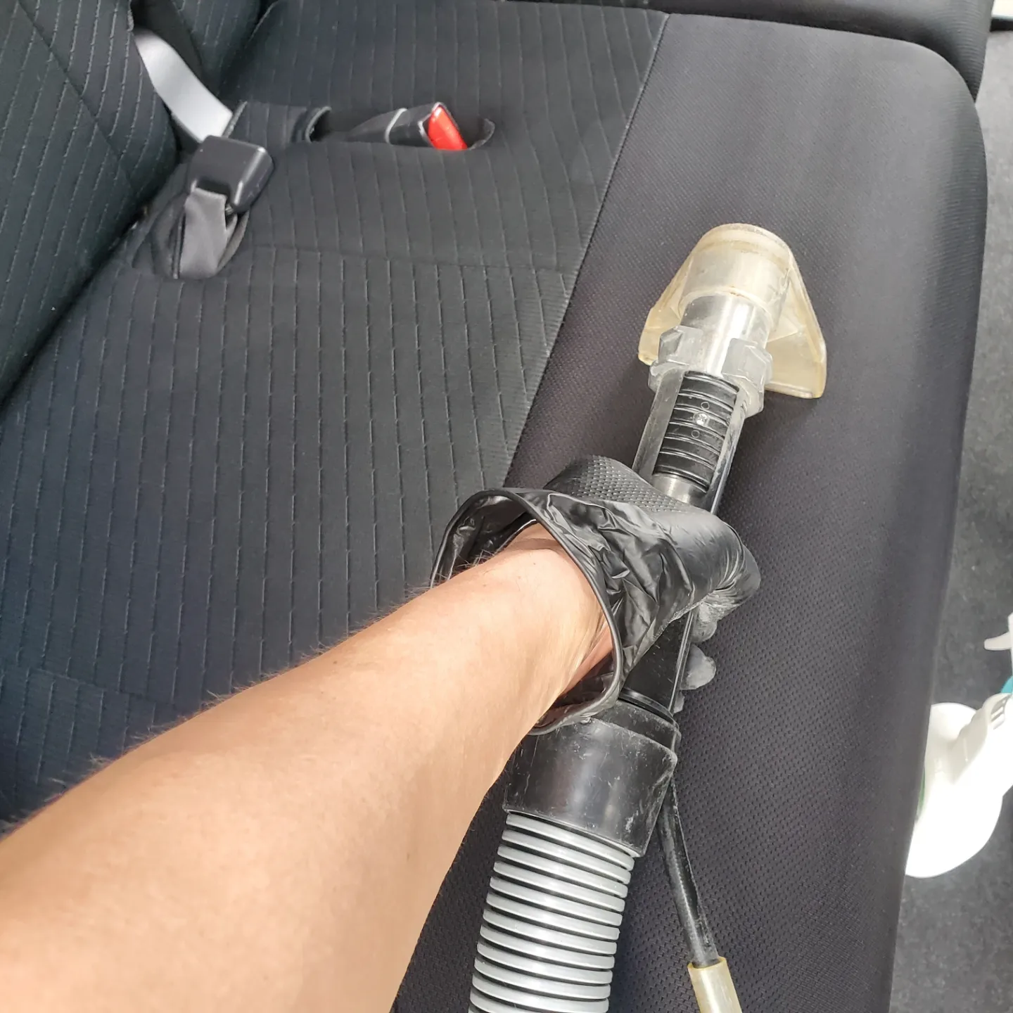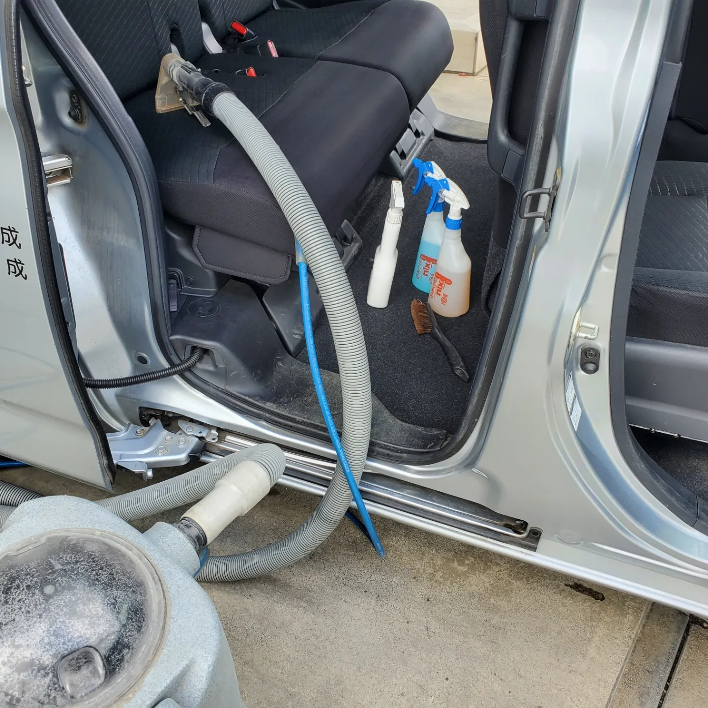 後部座席シートとシート周辺のフロアカーペットを専用のクリーナーでブラッシングしてから、80℃の温水スチームで洗浄クリーニングしながらの吸引で隅々までクリーニングしてリフレッシュ!