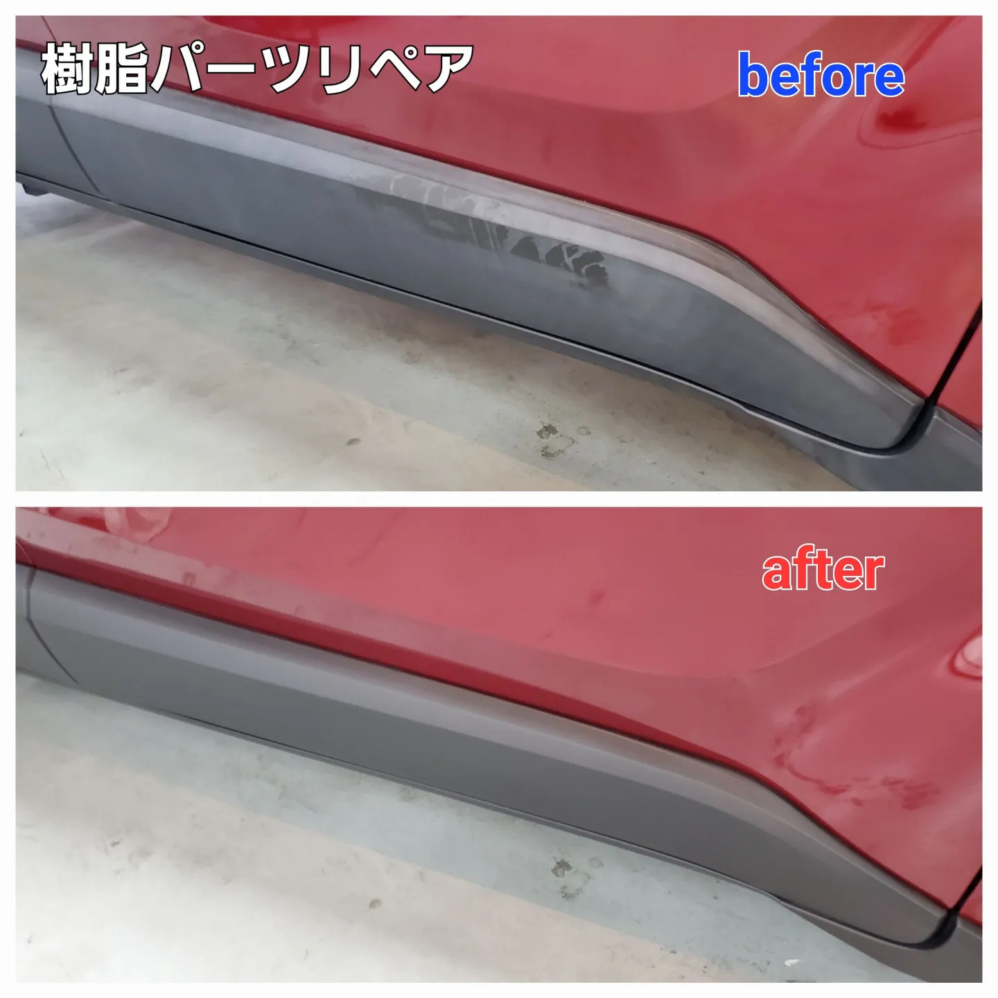 バンパーやドアの樹脂部分が劣化のため白く色褪せしてしまってお困りのお客様よりボディー磨きと樹脂パーツリペアのご依頼をいただきました。