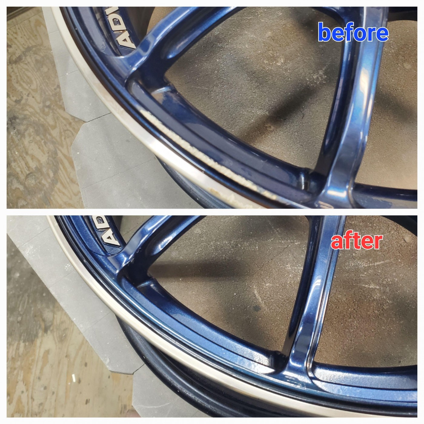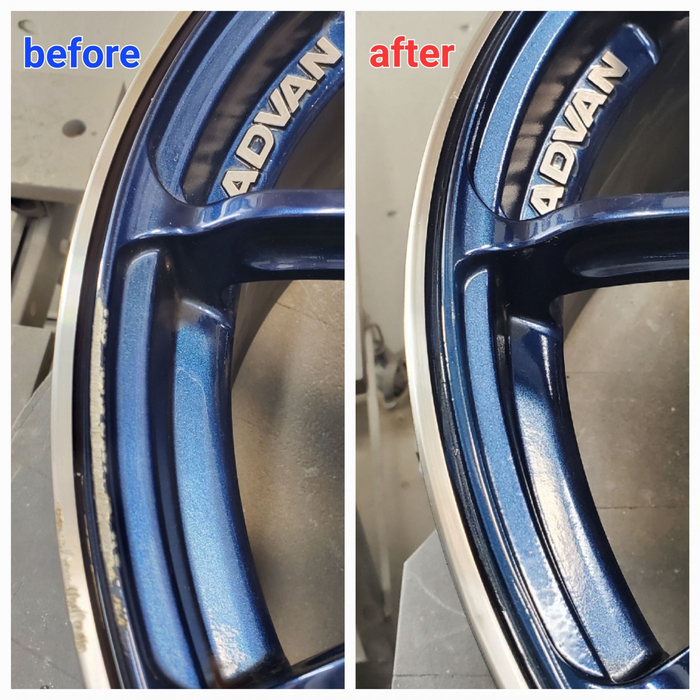 ADVAN Racingのブルーメタリック色のホイールでスポークとリムのがり傷でお困りのお客様よりリペアのご依頼をご依頼をいただきました。