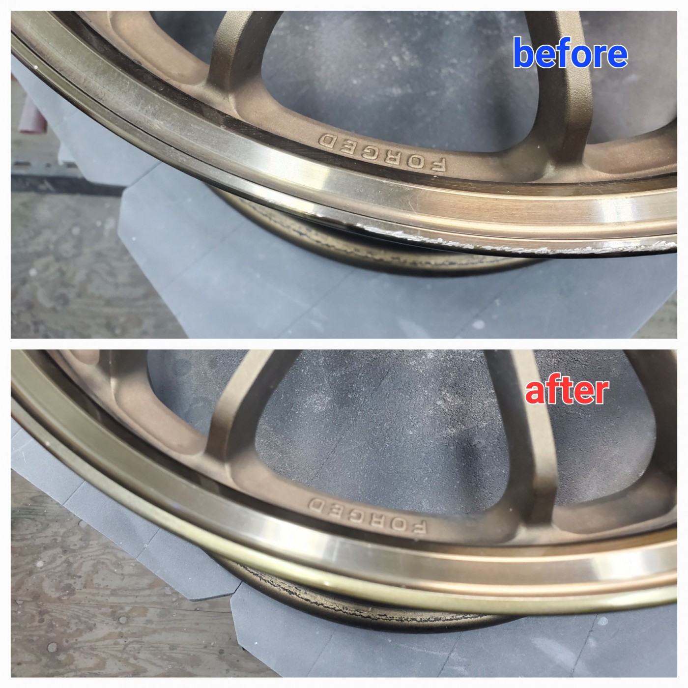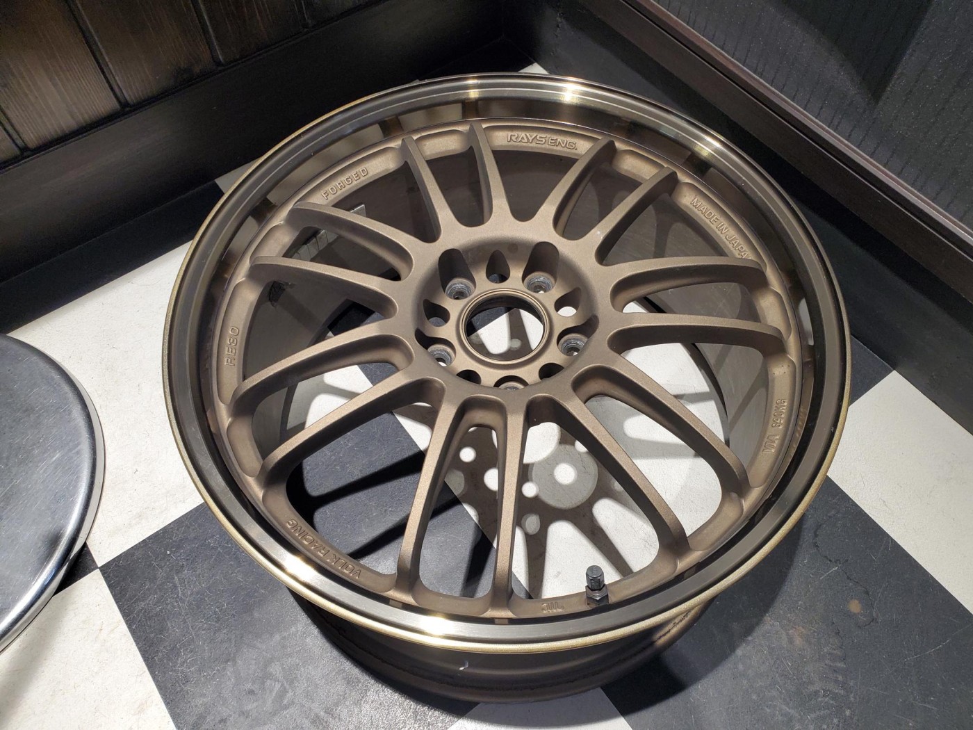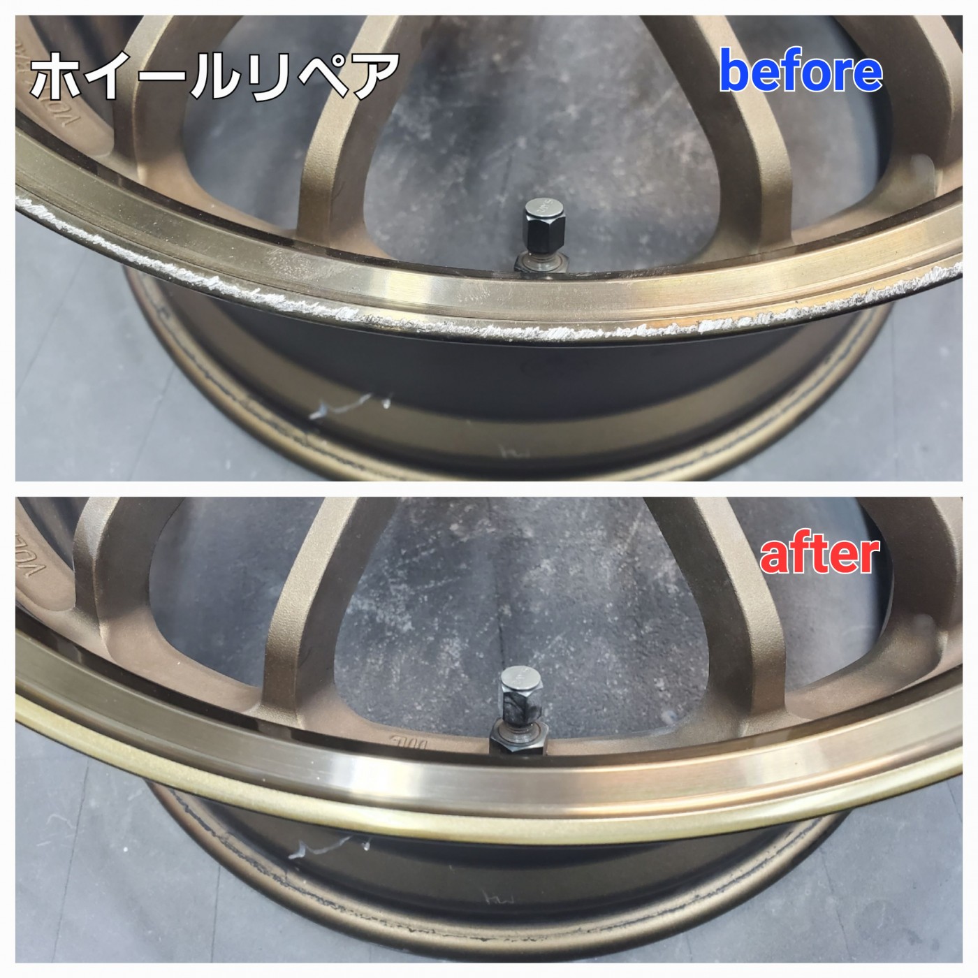 RAYSのゴールドカラーのホイールで、リム部のがり傷でお困りのお客様よりリペアのご依頼をご依頼をいただきました。