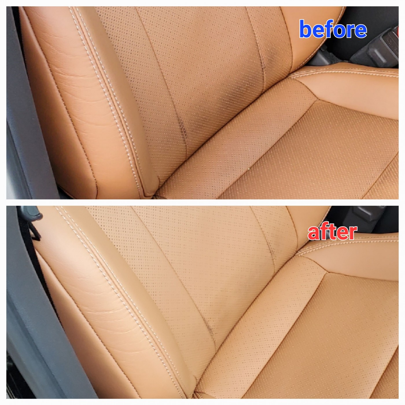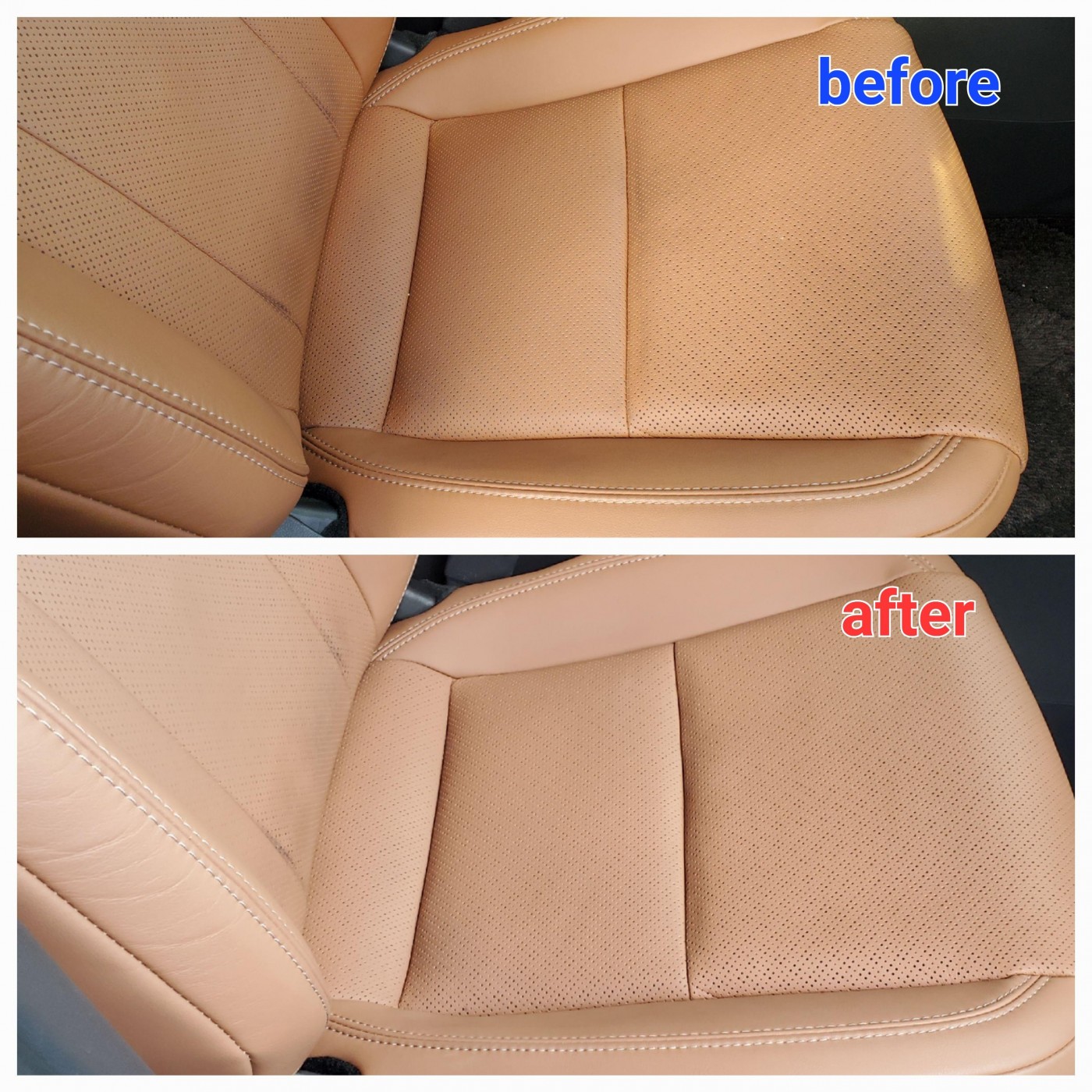 専用のクリーナーでブラッシングと拭き上げ、乾燥をレザー表皮を痛めないように数回に分けて施工し、付着色を落として最後にレザー専用のコーティングを塗り込み施工完了!!