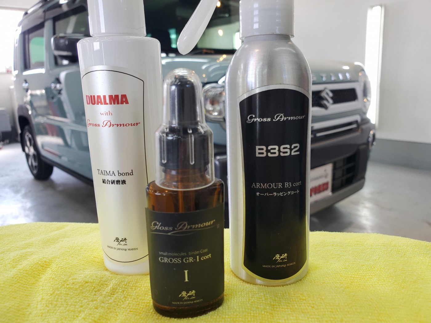 先ず初めに、ボディークレンジングからのボディー磨きにて雨染みや洗車傷をリセットして、TAIMA(コーティング結合研磨液)にて下地処理をしっかりと施工してから、ガラスコーティングのグロスアーマーを塗り込みして施工完了!