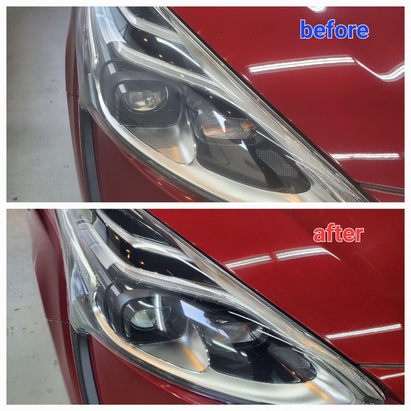 先ずは、表面のハードコートをサンディングして黄ばみ、くすみ、細かな擦り傷をしっかり取り除き、そこから磨き仕上げして最後に皮膜材を塗り込んで施工完了!