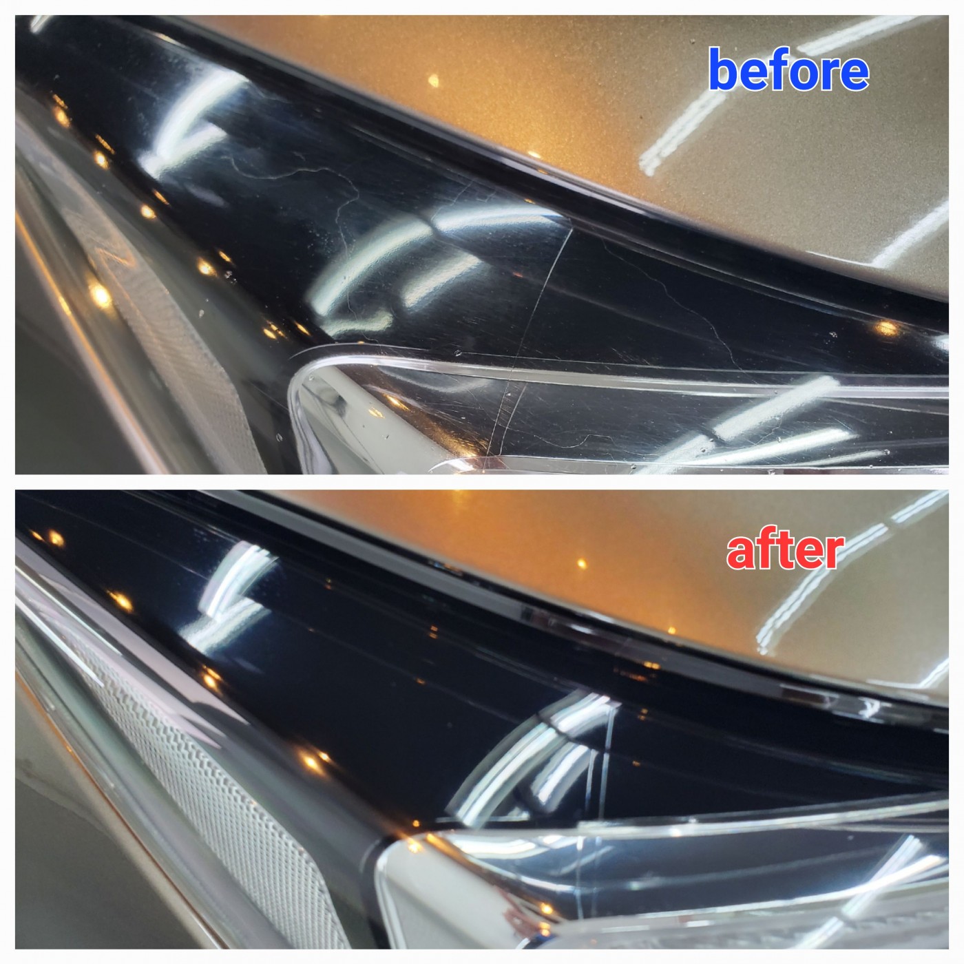先ずは、表面のハードコートをサンディングして黄ばみ、くすみ、細かな擦り傷をしっかり取り除き、そこから磨き仕上げして最後に皮膜材を塗り込んで施工完了!