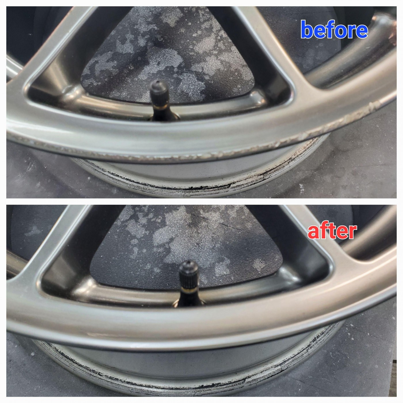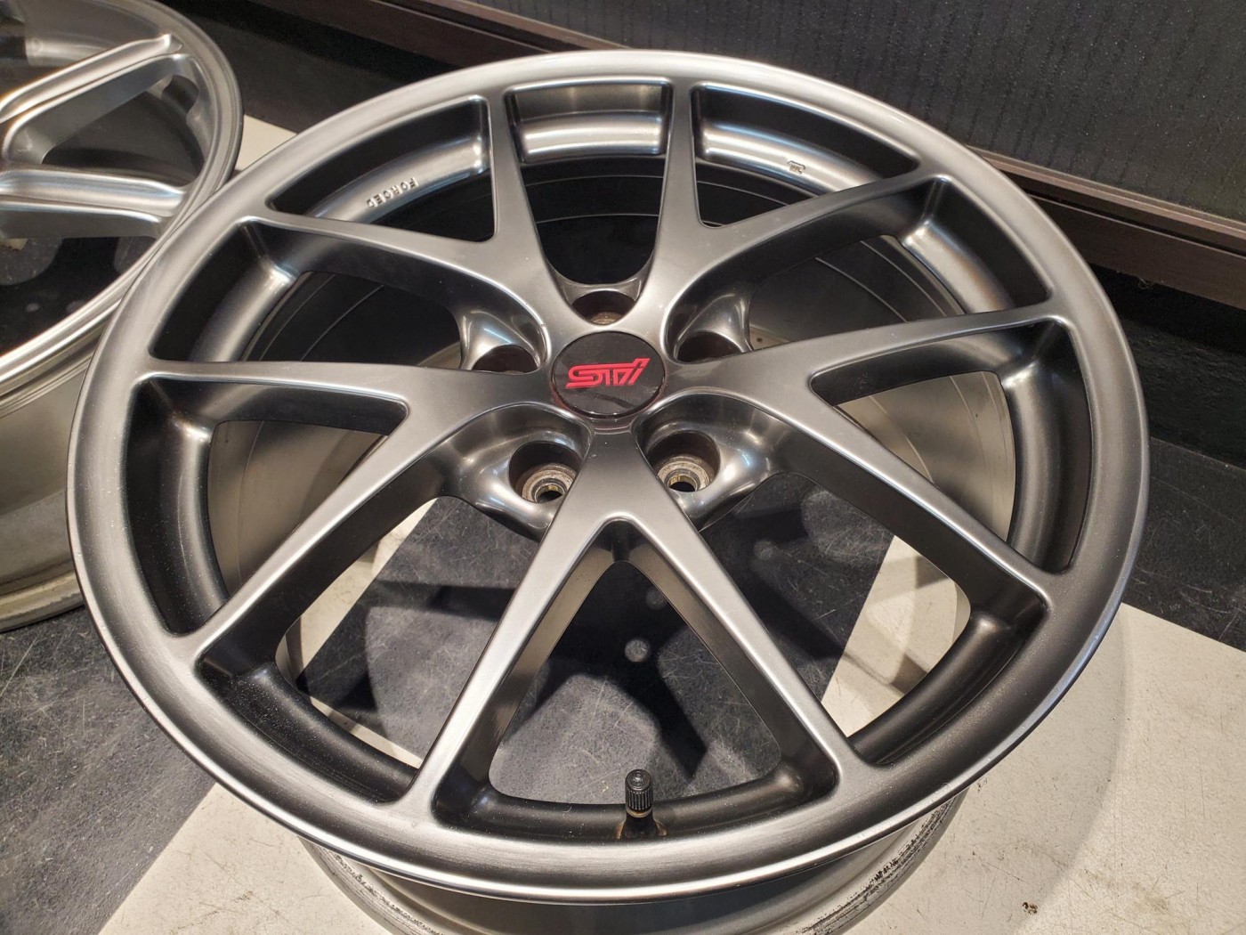 スバル純正STIのハイパーシルバーのホイールで、リムのほぼ全周のガリ傷でお困りのお客様よりリペアのご依頼をご依頼をいただきました。