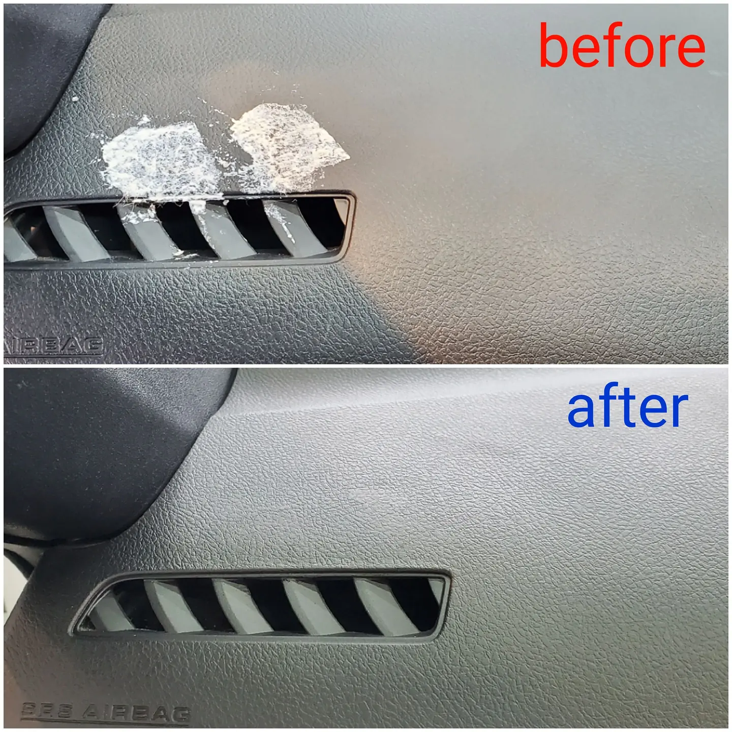 前オーナーのダッシュボードに付いていたレーダーを剥がしたところ接着剤で付いていたため、接着剤を剥がそうとして出来てしまった擦り傷、引っ掻き傷、糊残りでお困りのお客様から修復のご依頼をいただきました。