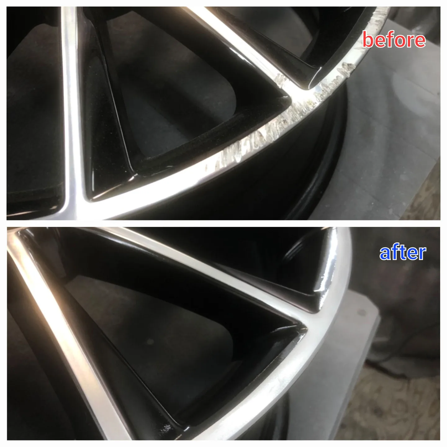 当社では、ダイヤカット処理の再加工も可能ですが、今回はリーズナブルなポリッシュ風の塗料で塗装仕上げにてリペアいたしました。
