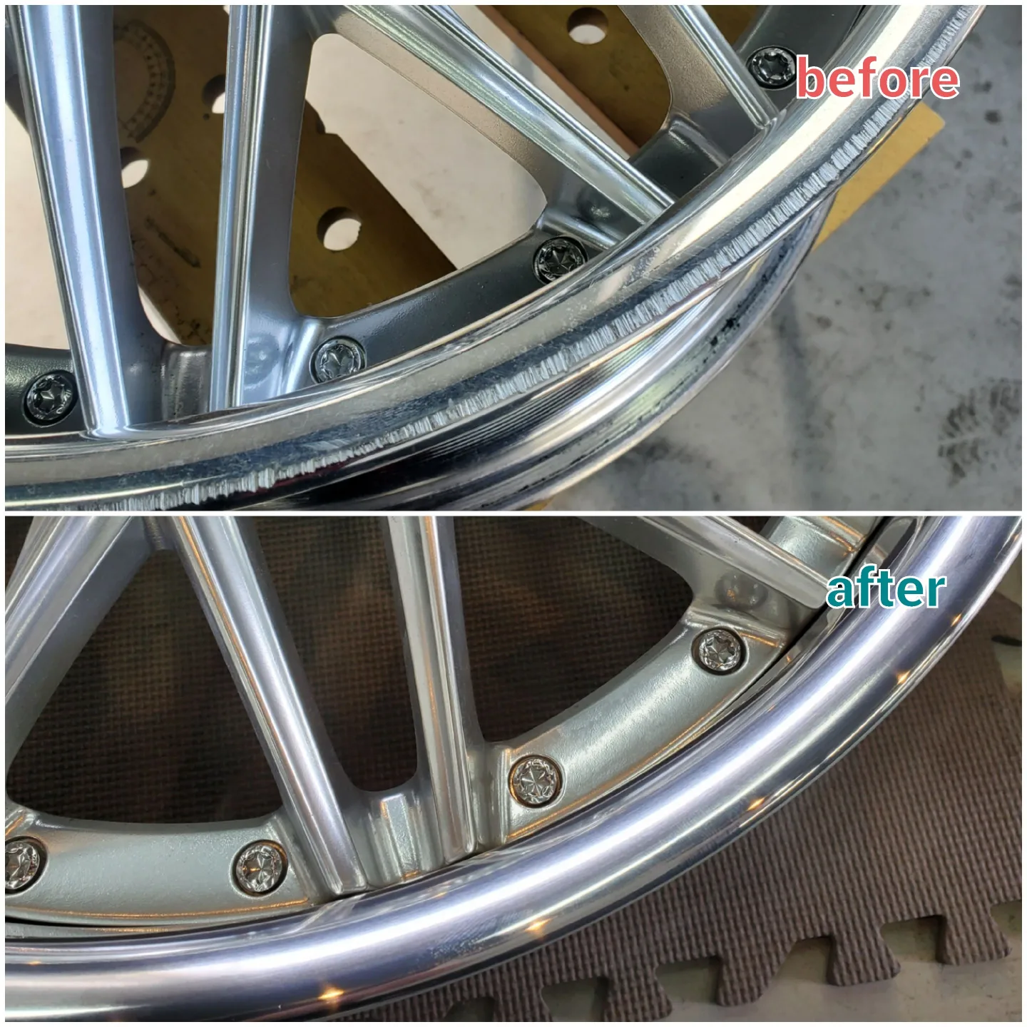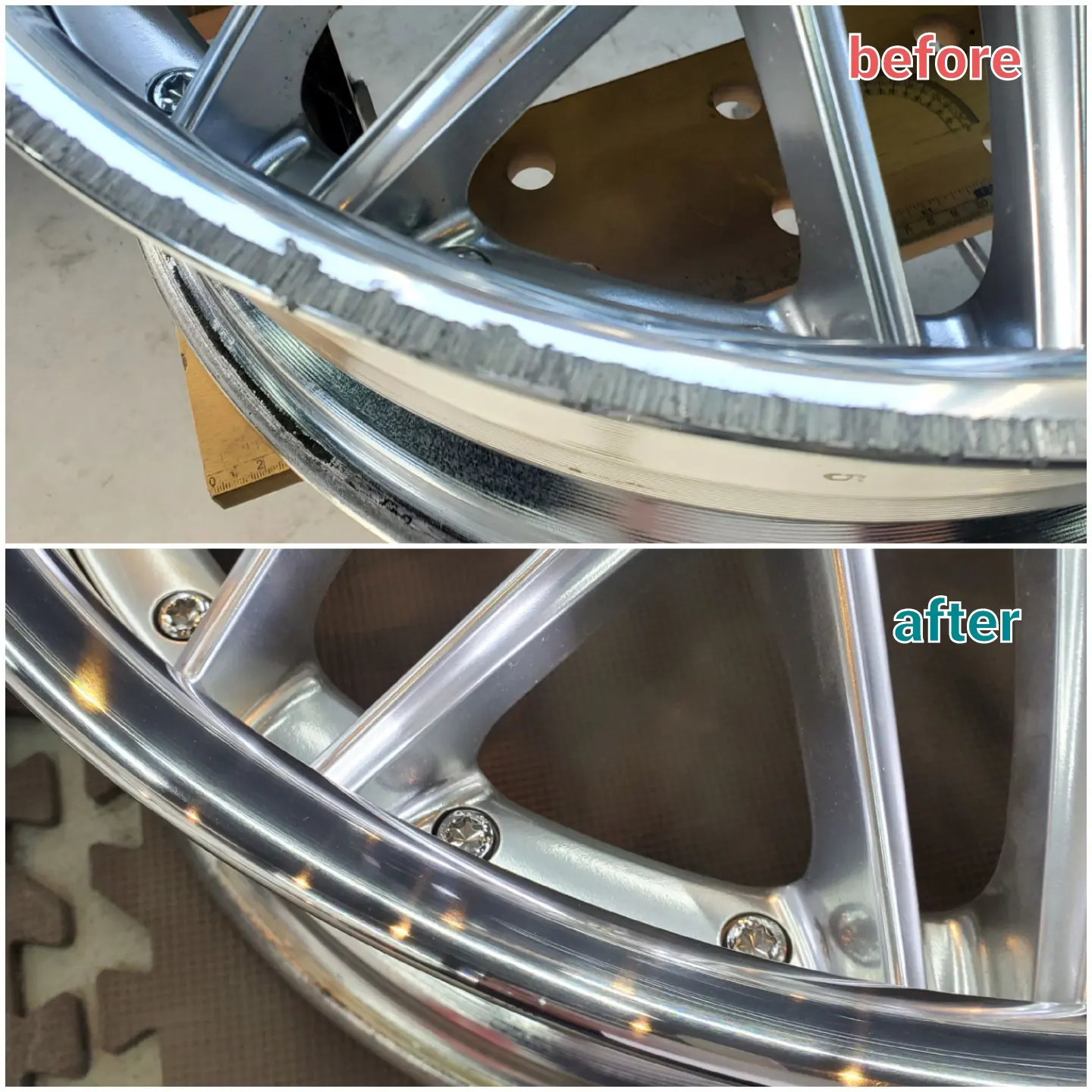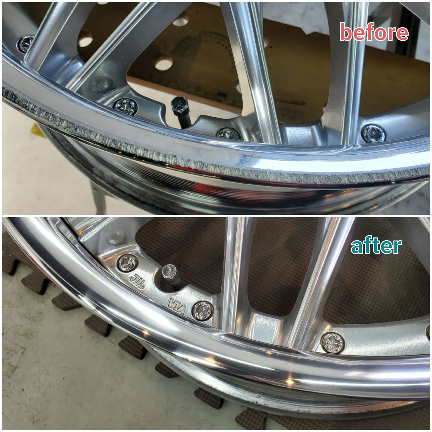 縁石に寄せすぎてガリ傷を付けてしまった客様からのご依頼で、アルマイトリムのがり傷のリペアをご依頼いただきました。