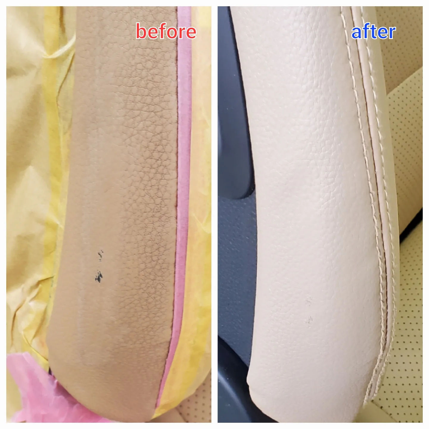 今回は、破れが酷いので部分張替えと細かな擦り傷の部分はレザー塗装でリペアさせて頂きました。