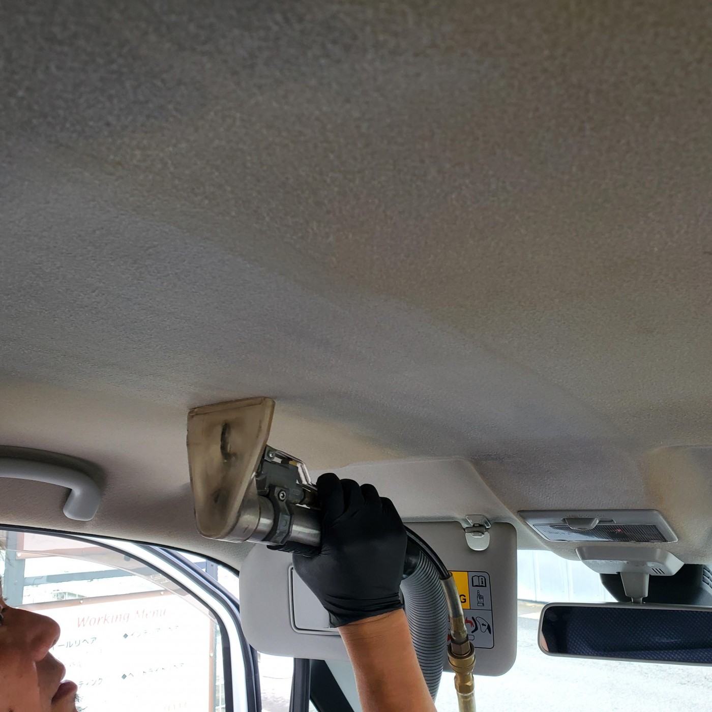 オゾン生成器でオゾン水を作り、スチームリンサーの中に入れてオゾン温水にてルーフライニングを洗浄してヤニ汚れを撃退しました。