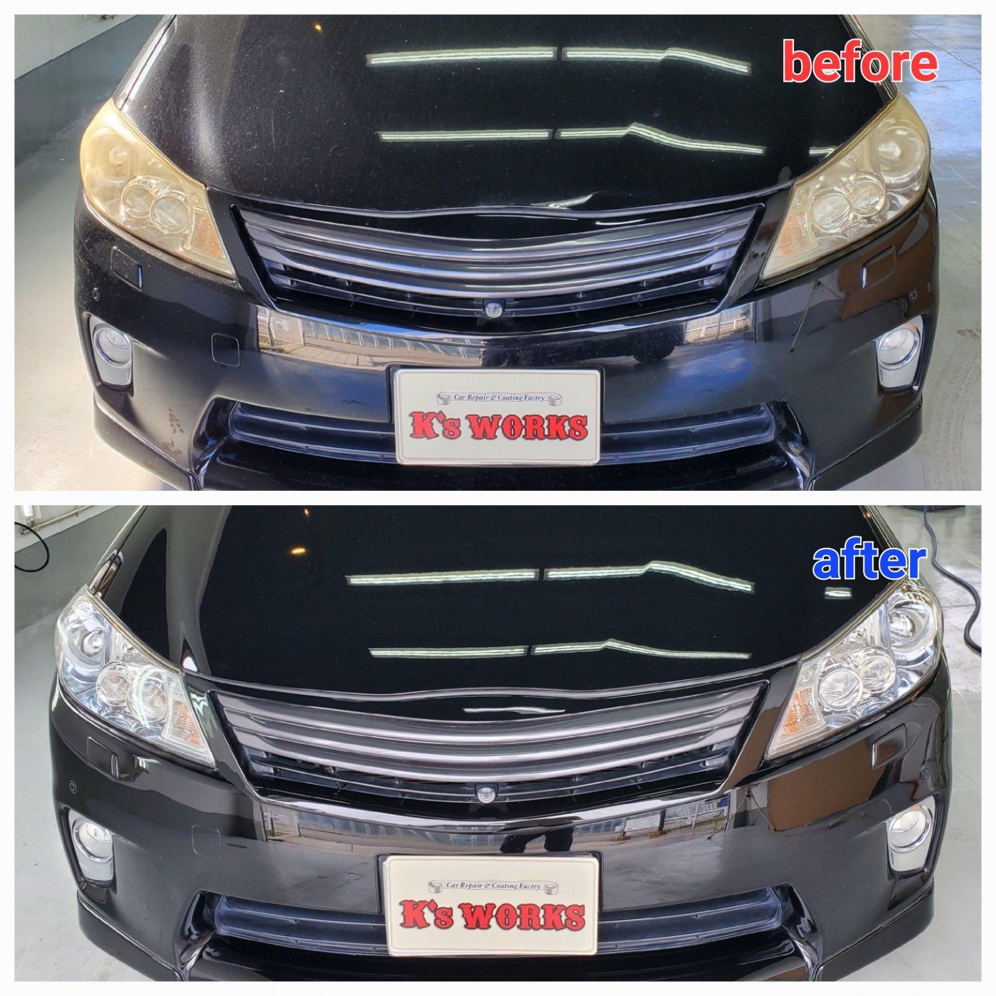 先ずは、表面のハードコートをサンディングして黄ばみ、くすみ、細かな擦り傷をしっかり取り除き、そこから磨き仕上げをして、最後に皮膜材を塗り込んで施工完了!