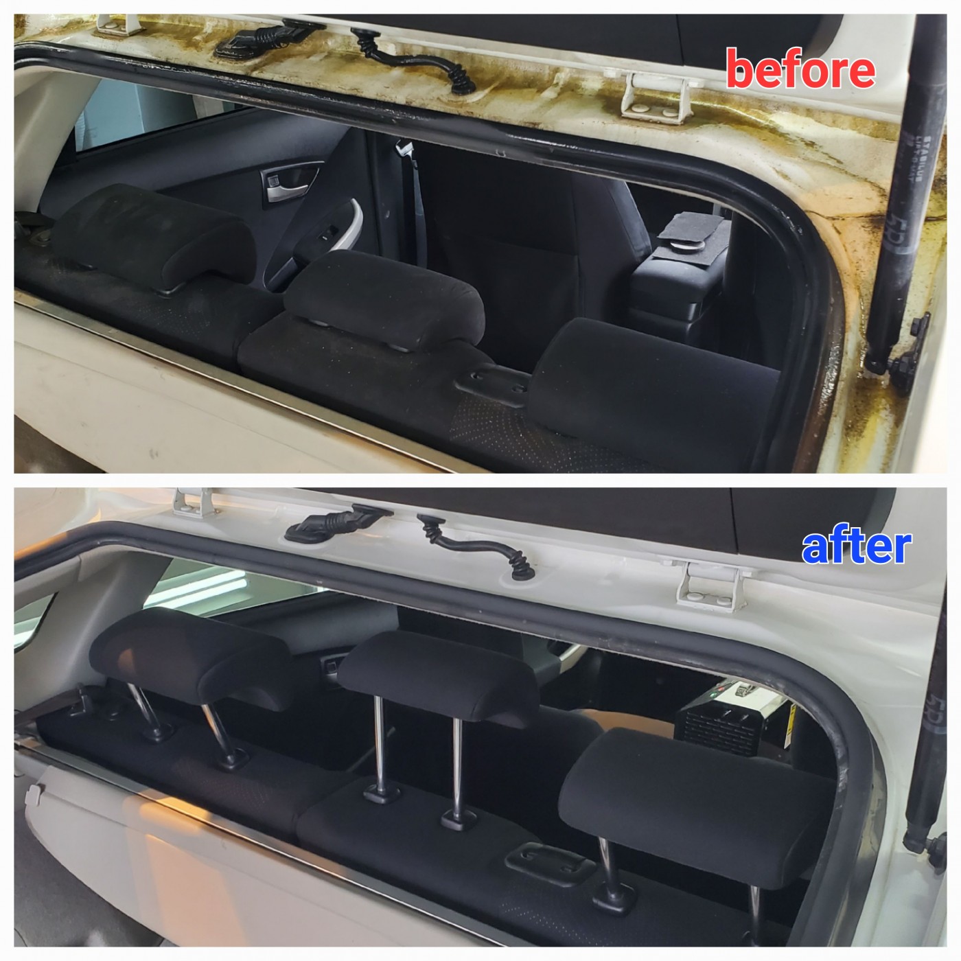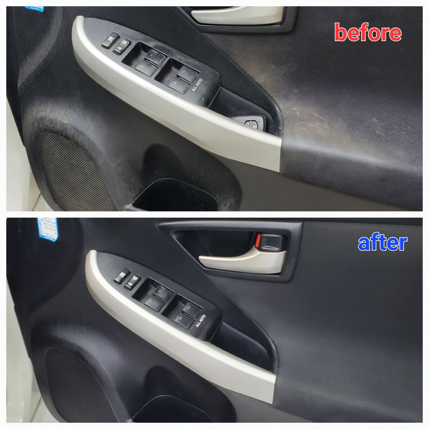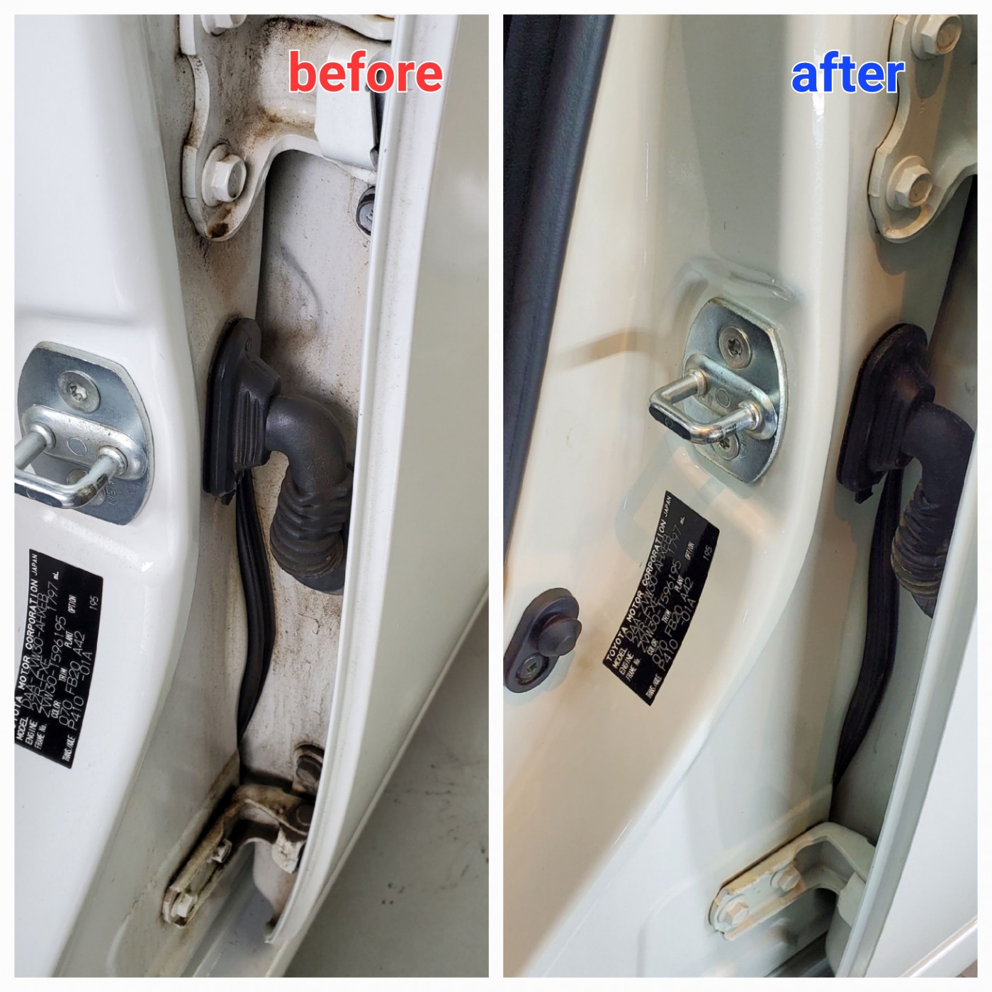 まず初めにドアヒンジ等のキワの汚れ/コケを洗浄してから、シートを専用のクリーナーで軽くブラッシングしてからの車内を隅々まで、まるごとクリーニングしてリフレッシュ!