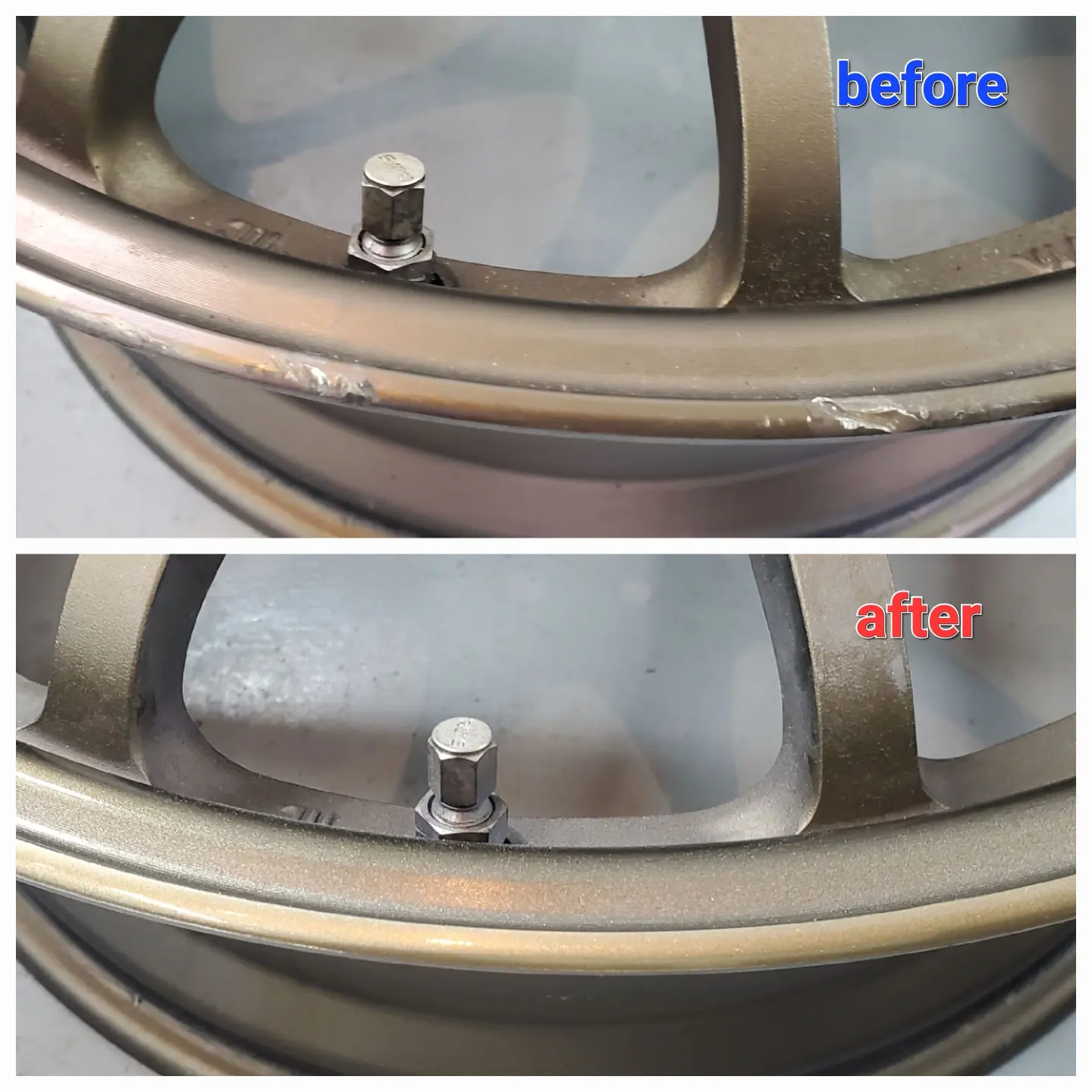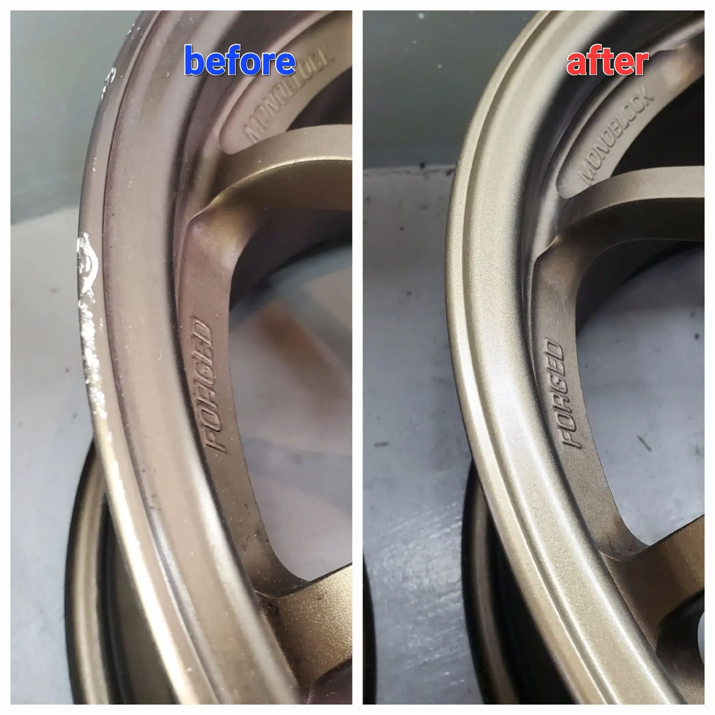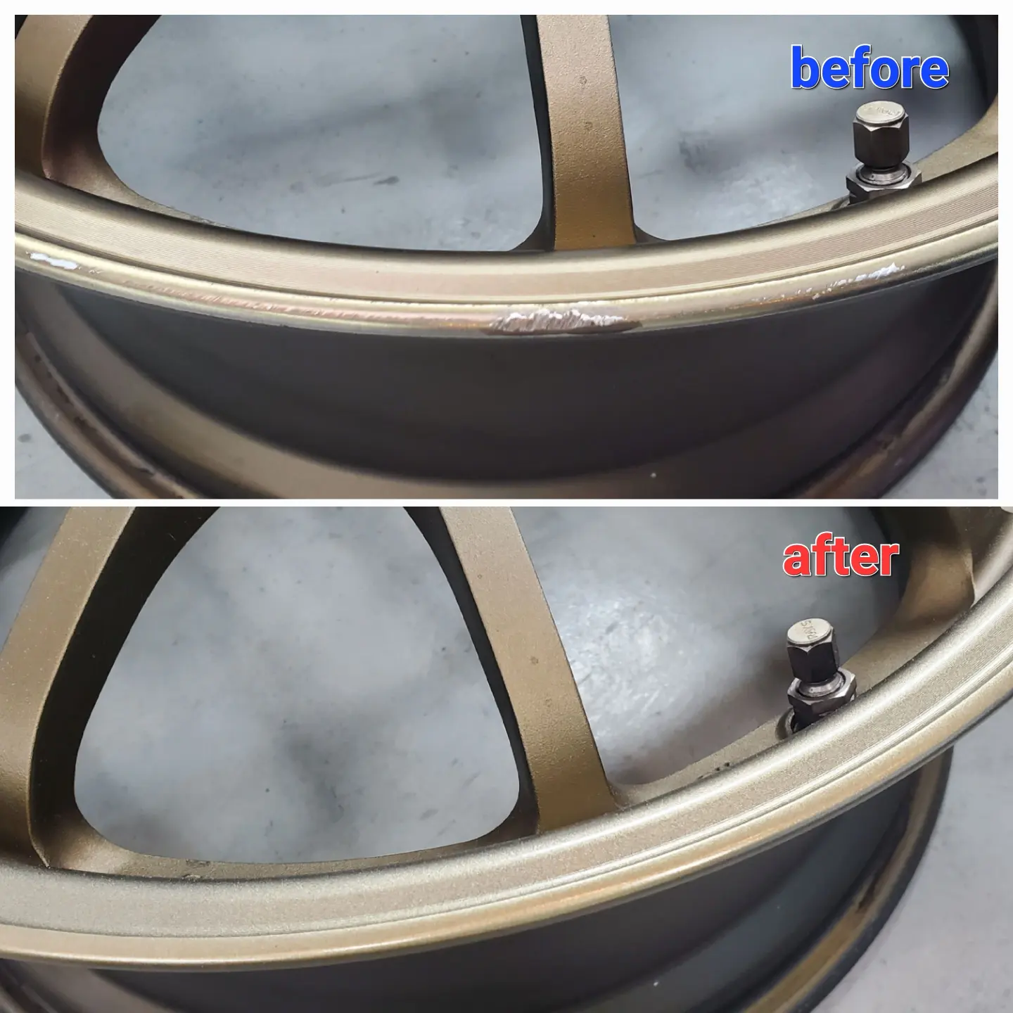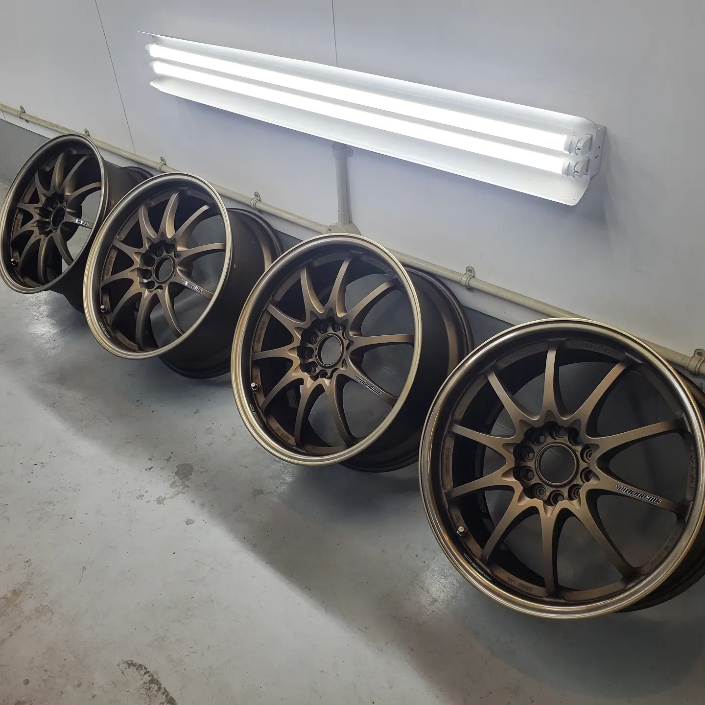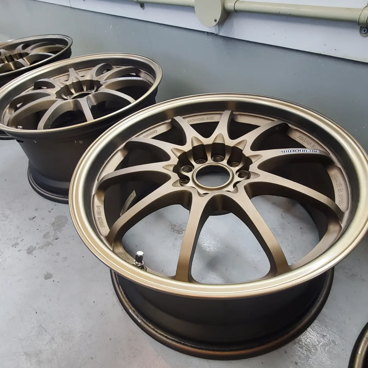 RAYSのブロンズアルマイト色のホイールリムのがり傷でお困りのお客様よりリペアとVOLK RACINGのステッカー貼替えのご依頼をご依頼をいただきました。