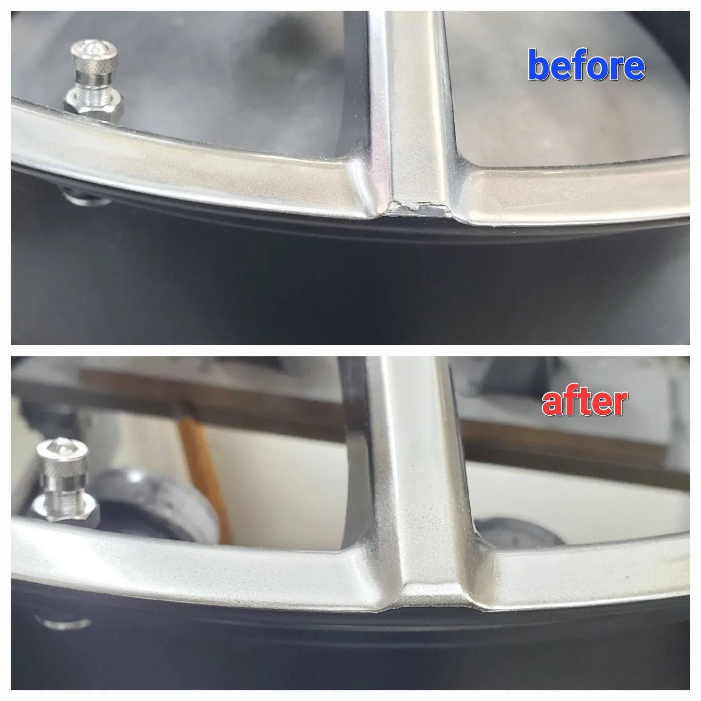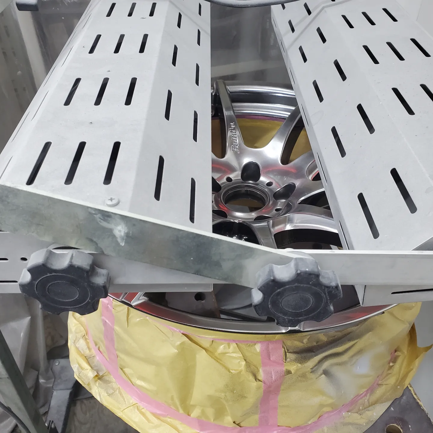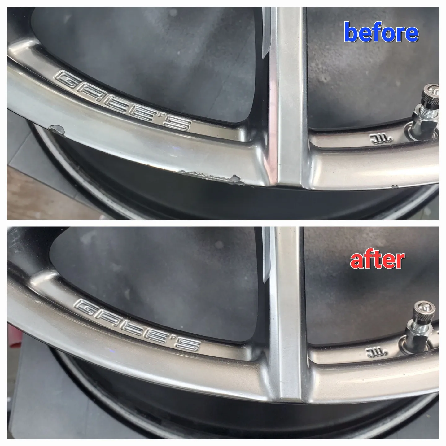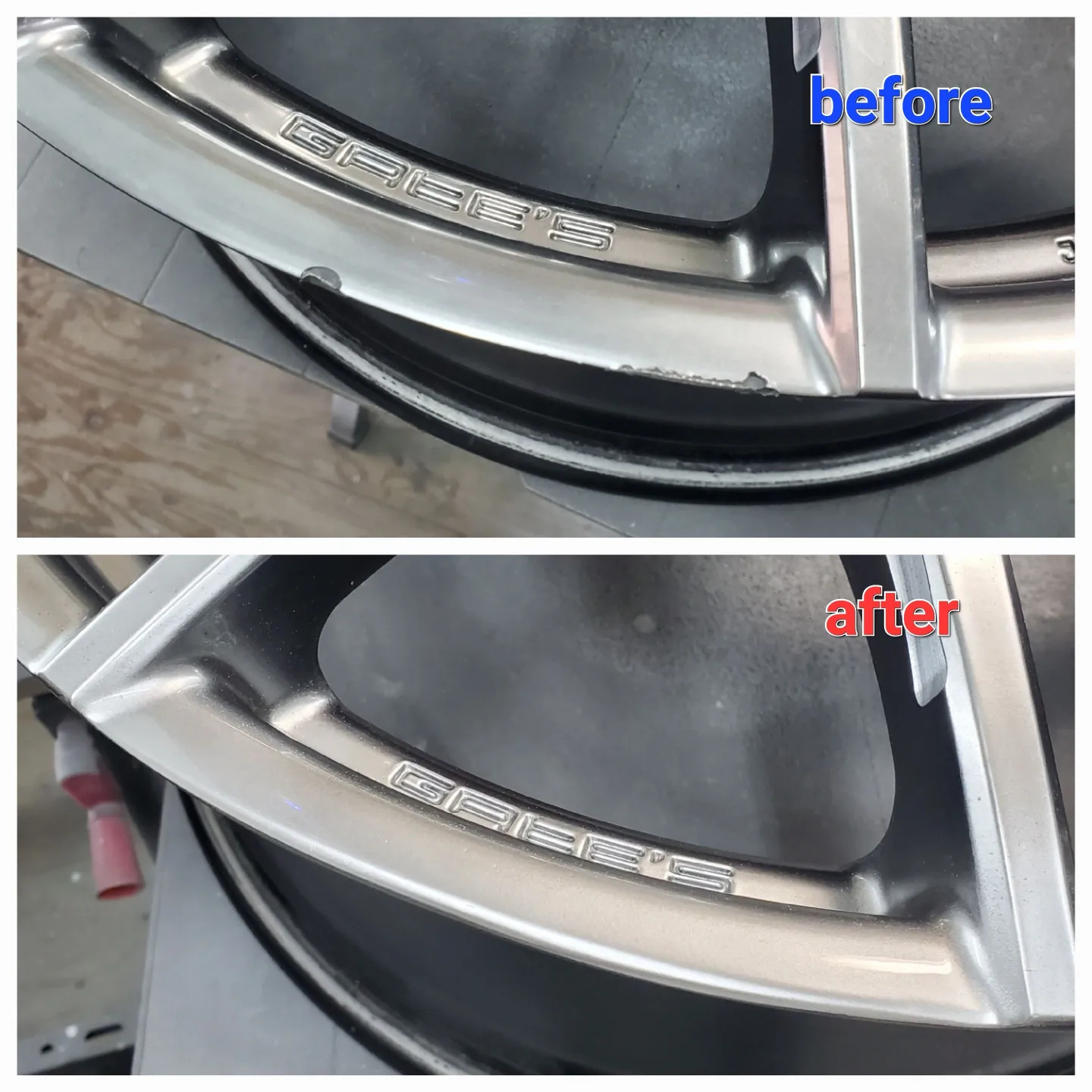 タイヤ交換時に誤ってタイヤチェンジャーでホイールに傷を付けてしまいお困りのショップ様よりのご依頼で、Balkenのハイパーシルバー色のホイールリペアをご依頼いただきました。