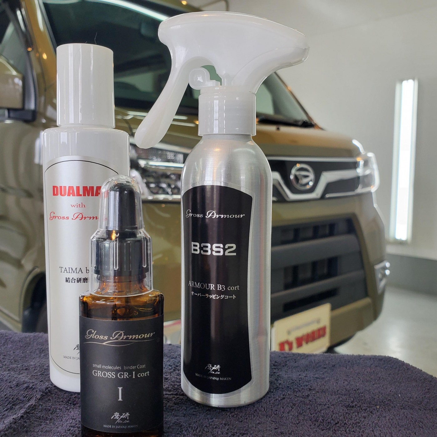 ボディークレンジングからの磨き上げとTAIMA(コーティング結合研磨液)にて下地処理をしっかりとしてボディーについた傷や洗車傷、雨染み痕などをリセットし、ガラスコーティングのグロスアーマーを塗り込みして施工完了!