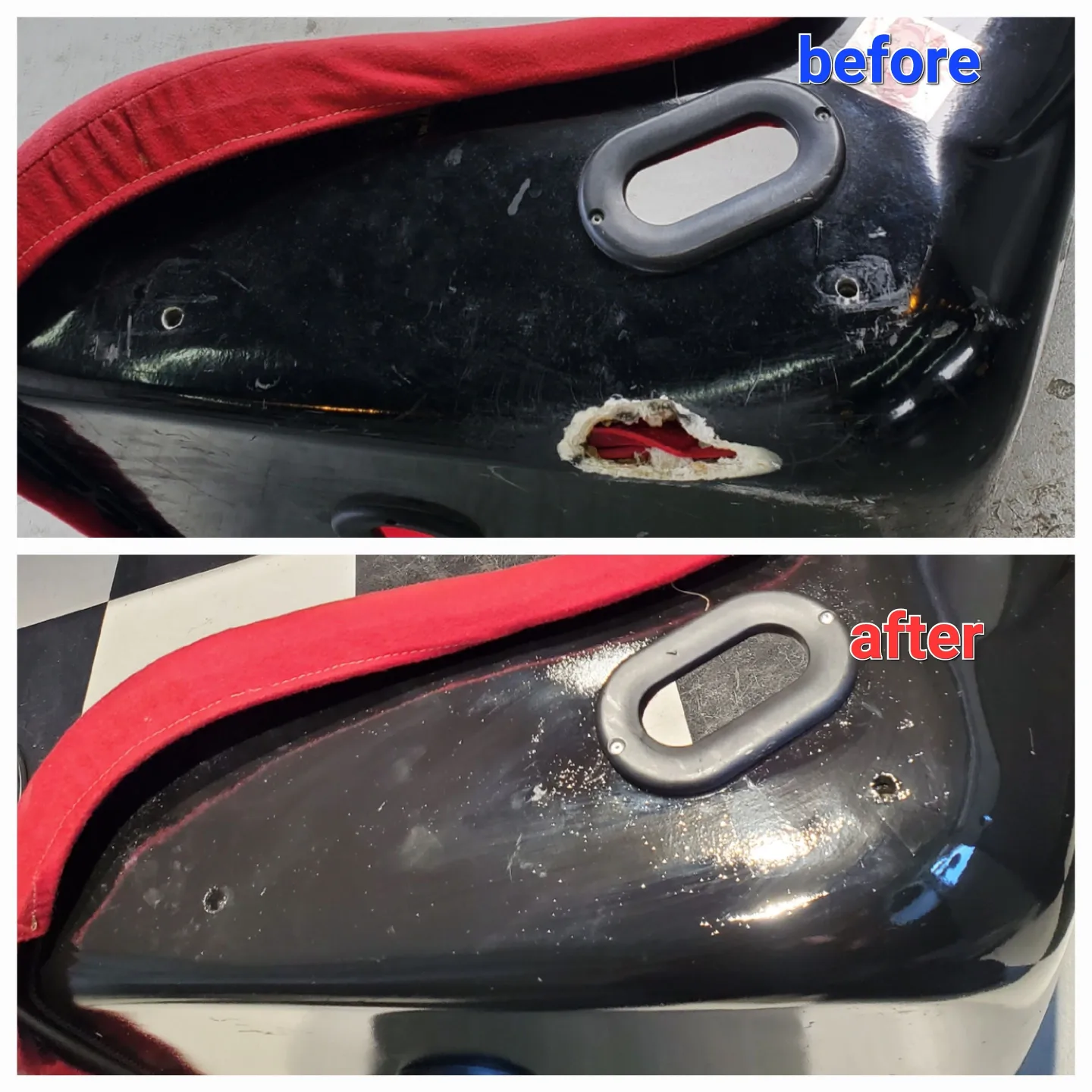 オークションにて購入したシートの下部分に大きな穴が開いているのと、サイドサポート部の生地が破れていてウレタンも欠落していてお困りのお客様より修復のご依頼をいただきました。