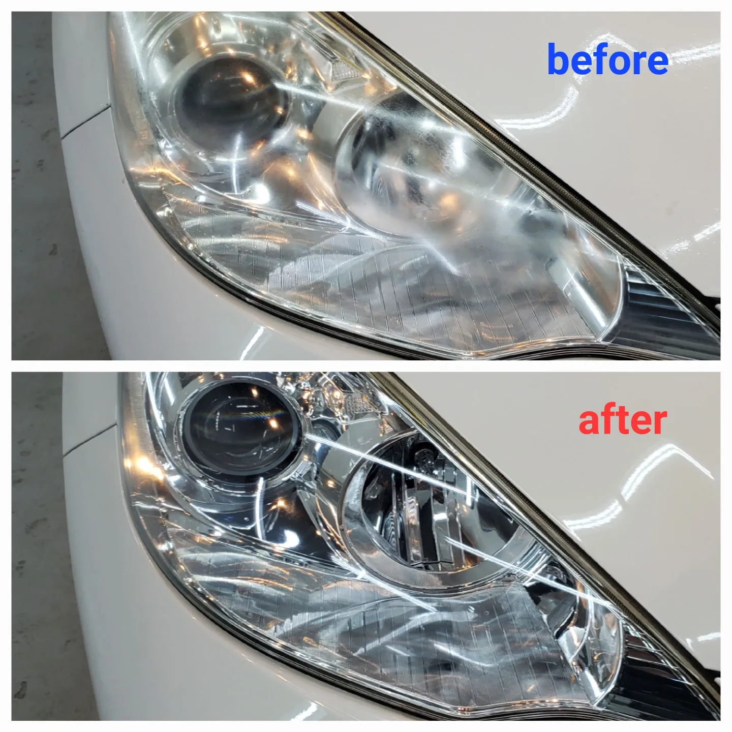 先ずは、表面のハードコートをサンディングして黄ばみ、くすみ、細かな擦り傷をしっかり取り除き、そこから磨き仕上げをして最後に皮膜材を塗り込んで施工完了!